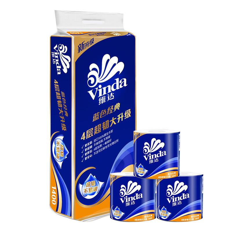 维达(Vinda)蓝色经典超韧有芯卷纸4层140克/卷 一提10卷 V4069 卫生纸 家用纸巾厕纸手纸