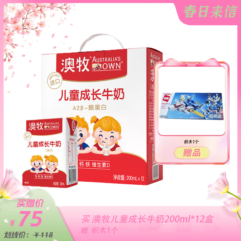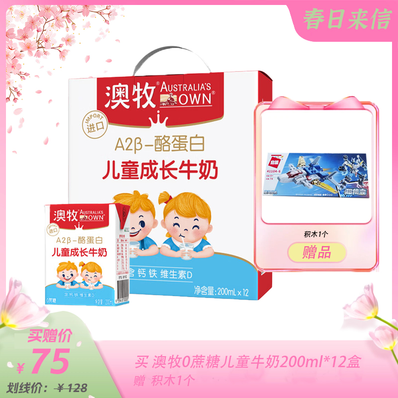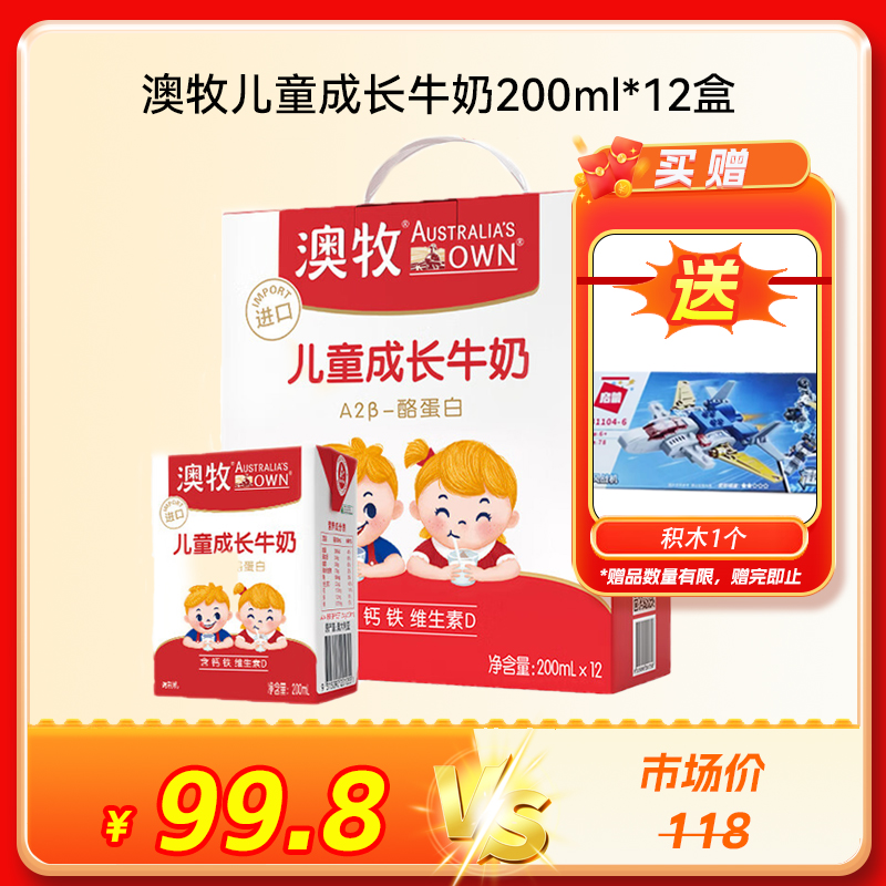 【买赠优惠】澳牧0蔗糖儿童牛奶200ml*12盒 赠 积木1个 款式随机