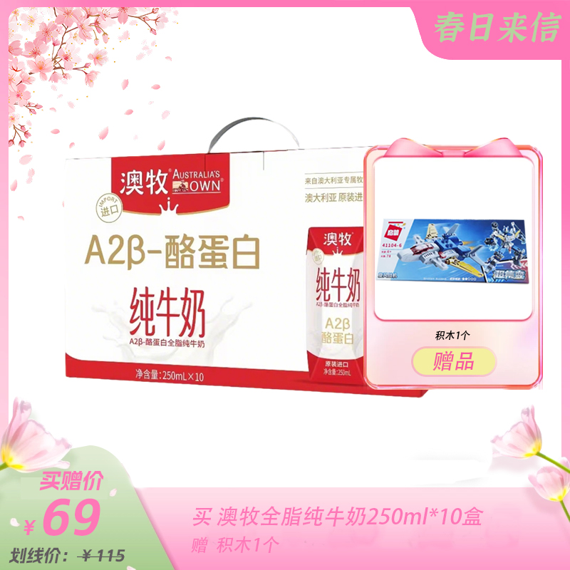 【买赠优惠】进口澳牧全脂纯牛奶250ml*10盒 赠积木1个 款式随机